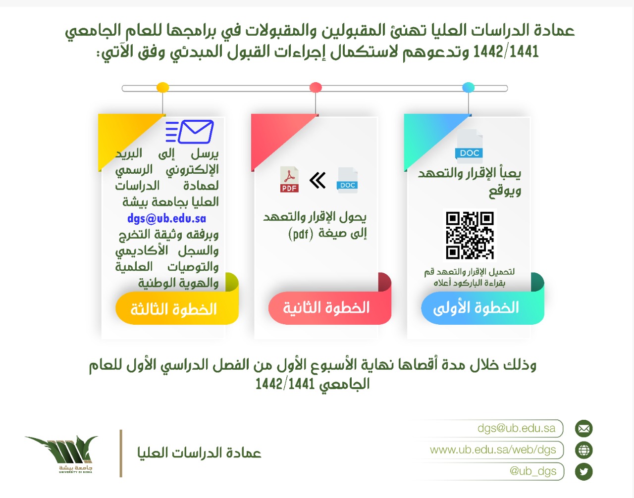 جامعة بيشة الدراسات العليا. منذ نشأة عمادة الدراسات العليا في جامعة الباحة حرصت للسعي في بناء القواعد الأساسية للعمل فبدأت في إعداد وتنظيم اللوائح والقوانين المنظمة لعملها واستحداث النماذج اللازمة لتسهيل عملها. وقد بدأت العمادة بالشراكة مع جامعات عالمية في عدد من برامجها في. إعلان أسماء المقبولين في برامج الدراسات العليا للعام. 2 أن يكون حاصلا على الشهادة الجامعية من جامعة سعودية أو جامعة أخرى م عترف بها.