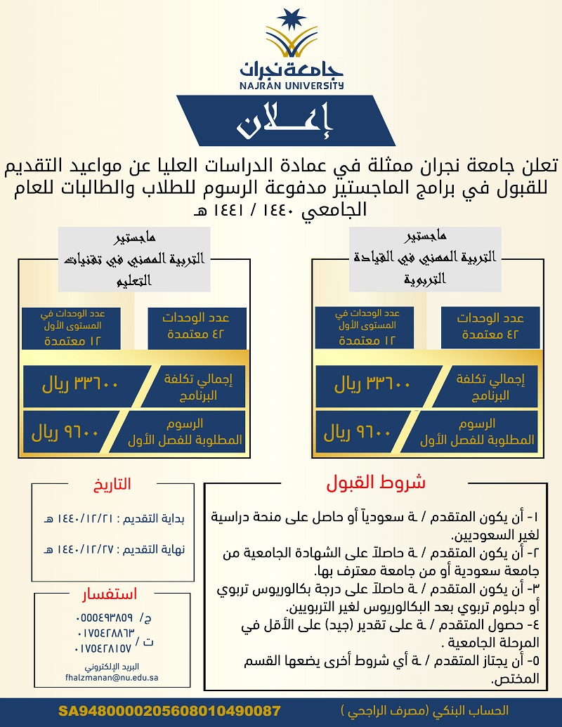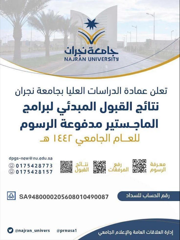 جامعة نجران الدراسات العليا. 113 designed and developed by ats ware comats ware com. بوابة القبول الموحد. الدراسة في جامعة الاميرة نورة عمادة القبول والتسجيل. نرحب بكم في عمادة الدراسات العليا بجامعة نجران والتي تهدف الى تمكين الطلاب المتميزين من حملة الشهادات الجامعية من مواصلة دراساتهم العليا محليا واعداد الكفايات العلمية.