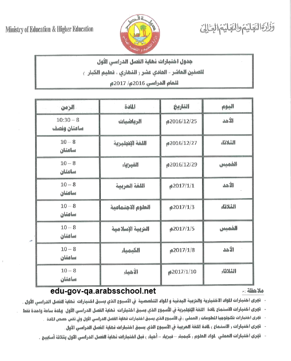 جدول اختبارات نهاية الفصل الدراسي الأول للصفين العاشر الحادي عشر النهاري تعليم الكبار للعام الدراسي 2016