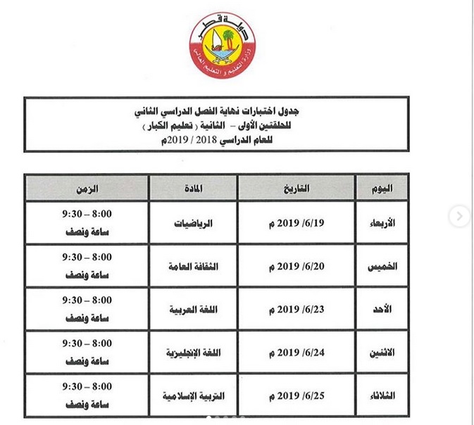 جدول اختبارات نهاية الفصل الدراسي الثاني 2019 تعليم لأجل قطر