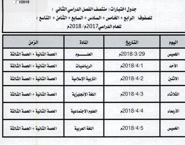 جدول اختبارات منتصف الفصل الدراسي الثاني طلبة المدارس النهارية و تعليم الكبار للعام الدراسي 2017 2018 للصفوف 1 11