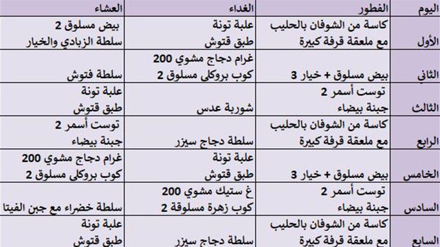 جدول رجيم لمدة اسبوع