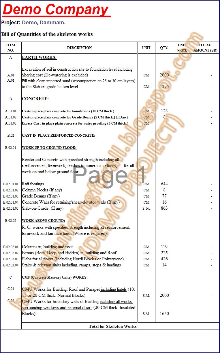 جدول كميات بناء فيلا. نقدم لكم ملف يحتوى على حساب كميات مبنى سكنى كاملا بدايه من اعمال الحفر والردم مرورا ب اعمال حصر كميات الخرسانه العاديه اللازمه للاعمال المختلفه فى المبنى والخرسانه المسلحه وكذلك حديد التسليح واعمال الكهرباء والمحاره. ورقي غلاف عادي حجم. في هذه الصفحة سوف تجد مواضيع عن boq لفيلا وجدول كميات بناء بالإضافة إلى اعداد جدول كميات بناء فيلا وجداول poq ميكانيكا كذلك اعداد جدول كميات تشطيبات علاوة على صفحات في مطلوب مهندس b o q أيضا جدول.