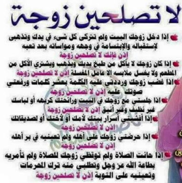 جزاء غضب الزوج على زوجته. وسنذكر بحول الله ما يتعلق بحقوق الزوجين بعضهما على بعض في الكتاب والسنة مستأنسين بشرح وأقوال أهل العلم. أوجب الإسلام على الزوج حقوقا تجاه زوجته وكذا العكس ومن الحقوق الواجبة ما هو مشترك بين الزوجين. يوجد بيت يخلو من المشكلات وليس هناك زوج لا يغضب ولا يثور لكن المرأة الذكية هي التي تعرف كيف تتصرف لتمتص غضب زوجها بهدوء ومحبة ولا تلح عليه بالسؤال عما به من ضيق إلا إذا صرح هو. طاعة المرأة لزوجها هي من الحقوق التي أوجبها الشرع للزوج على زوجته ومعناه أن تلتزم الزوجة بطاعة زوجها ولا تعصيه وتلين له ولا تمانعه فيما ليس فيه معصية لله ولا مخالفة للشرع وأن تلبي حاجاته حتى يكون.